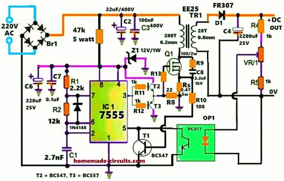One very important part here is the 47k / 5 watt resistor, because when power first comes, then the 7555 has no supply of its own so some starting current must come first from the 310V line.