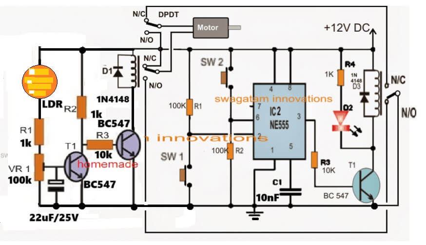 When the closing procedure ends, SW2 which is positioned at the the other end of the door mechanism responds to the closing of the door pressure resets the IC2 such that its relay now chnages from N/O to N/C. This action instantly cuts off the other negative line to the N/O contacts of the DPDT.aking sure that the motor shuts off again and stays in that position until dawn sets in.