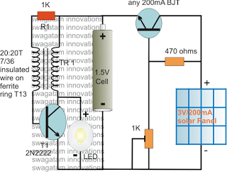 The design also employs a feedback stage which makes sure that the LED lamp is not able to switch ON as long as the solar panel is generating a voltage, or in simple terms as long as it is not significantly dark outside.