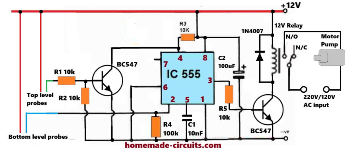 You have updated so many circuits over water level controller and i also need a circuit for automatic water level controller but using a single IC or single microcontroller. I have used ne555 for this but there is a problem that some time (not all the time) it starts after the power cut (electricity breakup) while its lower probes are touching the water. (Motor should start only when its lower probes are not in contact with water). If this problem can be fixed please suggest the solution or give me a circuit design using single chip (IC or microcontroller like PIC16f676).