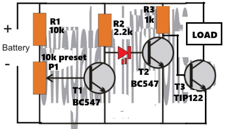 But when the battery voltage drops below the preset level, then T1 turns OFF and the node rises via R2. At that point the LED becomes forward biased and lights up, so now the base of T2 gets proper bias and T2 turns ON. Once T2 turns ON, the TIP122 base is pulled LOW and therefore the LOAD disconnects.