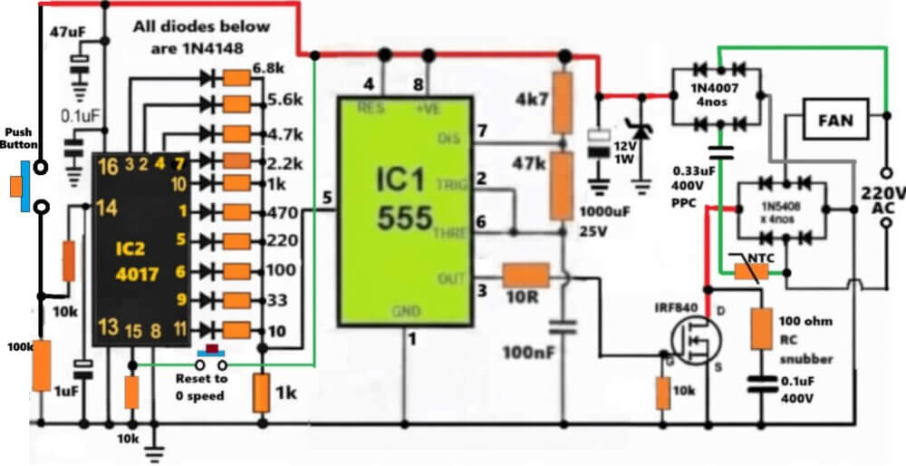 Simple 220V AC Fan Regulator Circuit using Push Button