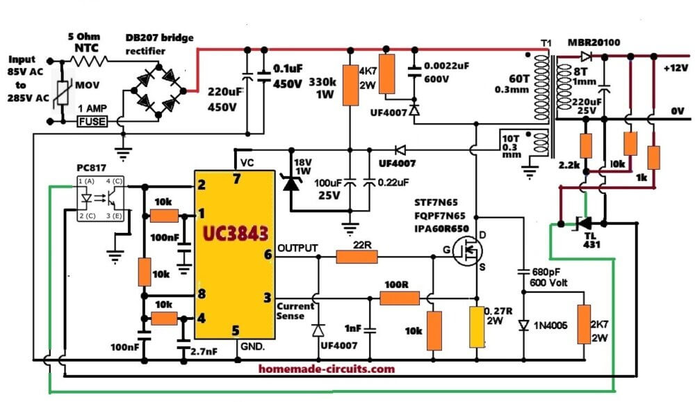 So overall this UC3843 SMPS design gives around 60W SMPS, works across wide AC input from 85V AC to 265V AC RMS, to produce a stable 12V DC output at high current of 5 amps, and if transformer is built properly then it runs without any issues...