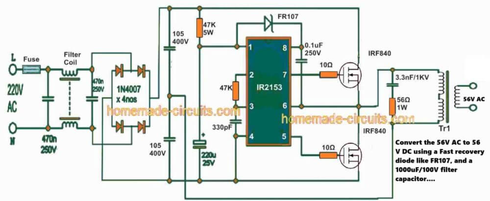 In this article we will try to understand how to build a 220V AC to 48 V DC SMPS circuit for charging all types of 48V batteries, using the nice little IC IR2153. However, since 48V battery will require a 56V DC, so we will rather discuss a 220V to 56 V DC battery charger […]