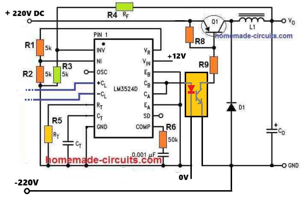 In this buck converter we additionally see that current sensing pinouts +CL and -CL of the SG3524 are configured for implementing output current limiting, or for delivering a constant current output for the converter.