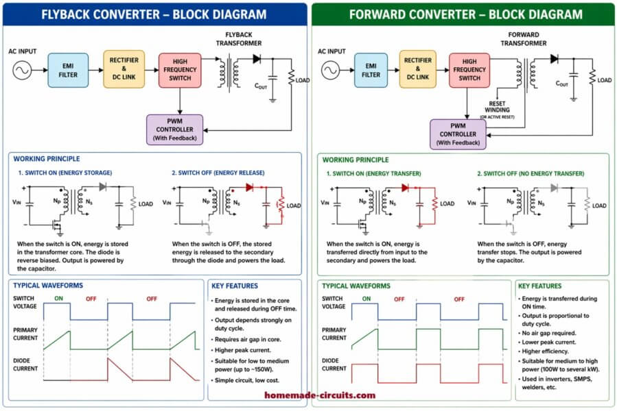 Flyback stores energy and then releases, Forward transfers energy instantly, Flyback is simple but power limited, Forward is more complex but efficient.
