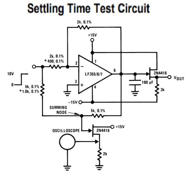 The oscilloscope is placed at the summing node through the FET isolation, so you can monitor how fast the op amp output settles to final value after the step. This is how they measure settling time specification.