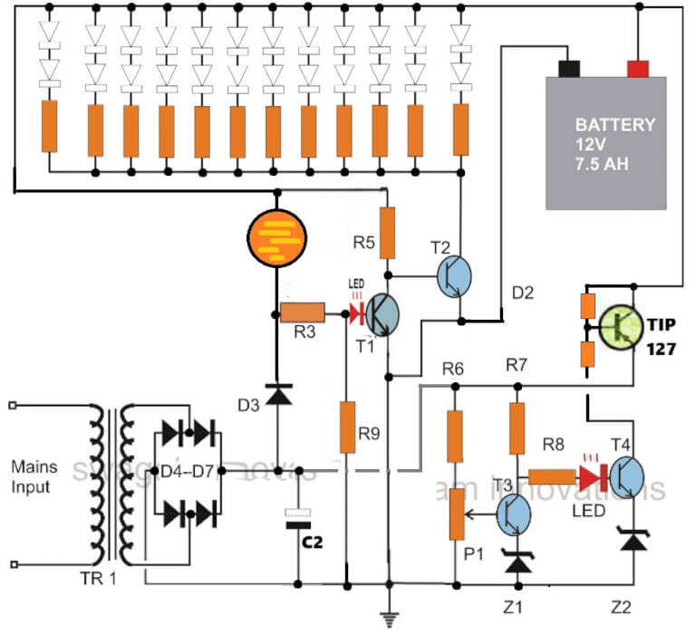 The following design of the proposed day/night automatic emergency LED lamp circuit with battery overcharging protection uses only BJTs and looks indeed very simple. Let's understand how it works: