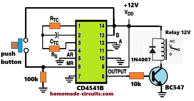For long delays, CD4541 stays better than NE555, because 555 usually needs huge capacitor, leakage error comes, long stability becomes poor, but here small RC enters divider and long delay comes clean.