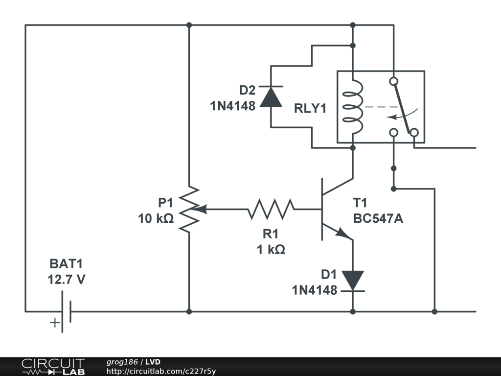 The low battery sensing is handled by R3 and P1 which forms a potential divider to set the base voltage of the relay driver transistor (T2). When the battery voltage drops below a set threshold the voltage at the base of T2 falls below Vbe (0.6V–0.7V) turning OFF the relay and disconnecting the load.