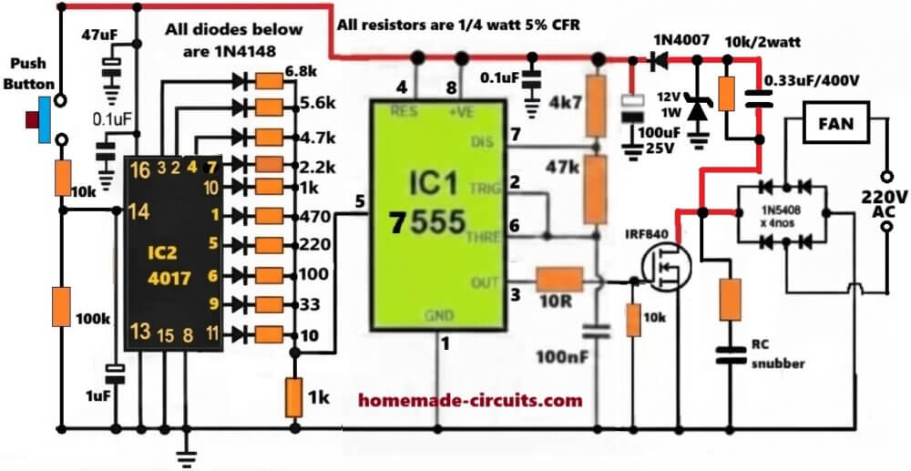 In this post we learn about this 220V AC electronic fan regulator circuit using a push button which changes speed step by step with each press. We press the button, then circuit cleans the signal, counts it properly, and then selects a relevant fixed speed level. Each button press moves the fan from OFF to low, then medium, then high, and finally maximum, and then it repeats.