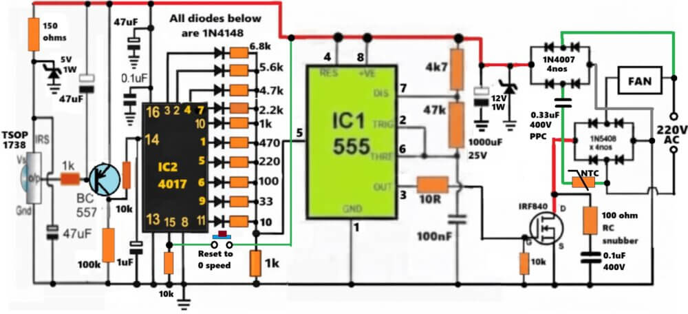 The complete design for the proposed remote controlled fan dimmer circuit can be witnessed below: