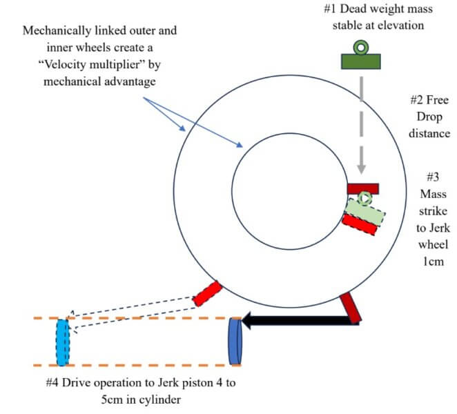 A solid, specific-weight mass must be lifted to a specific altitude. This is referred to as the Drive Mass. It is a simple lever function. Mechanical connections hold that mass elevated until it is triggered to drop in freefall. - Retracting the Drive Piston