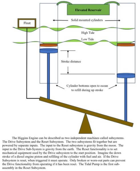 This should give you a fair picture of the conceptual functionality of the Higgins Engine. New technology, the Hydro-Sail, and the operational environment produce pollution-free electricity. Thank you, Nature, for the energy to operate our machinery. Sorry for the snub to your sunshine, rain, and wind. And given that you would have to be awfully pissed to hold back the tides on us, thank you.